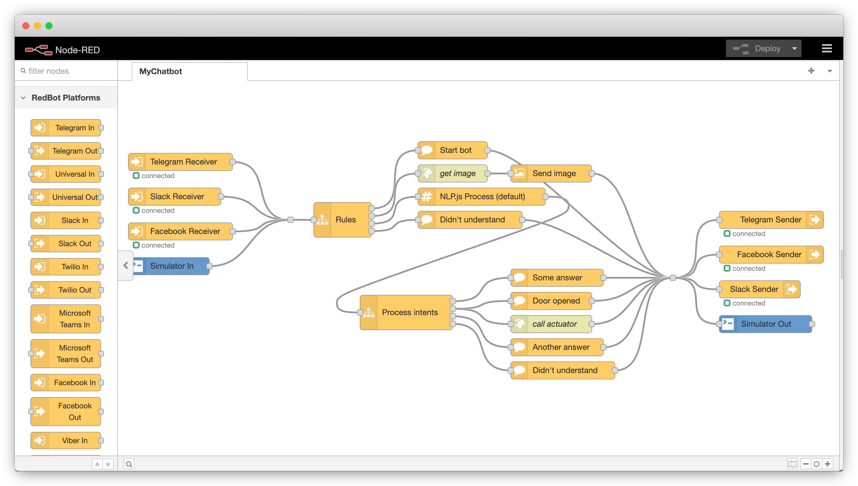 Node-RED flowsLet your chat bot interact with the Node-RED ecosystem: IoT, databases, external services. More than 1,000 flows and nodes are already available from the community
